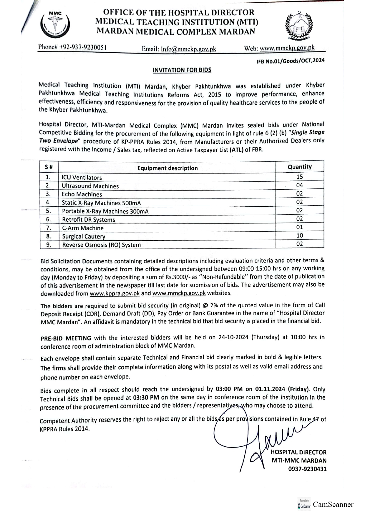 Invitations of Bids for 'Medical Equipments at MTI MMC Mardan'