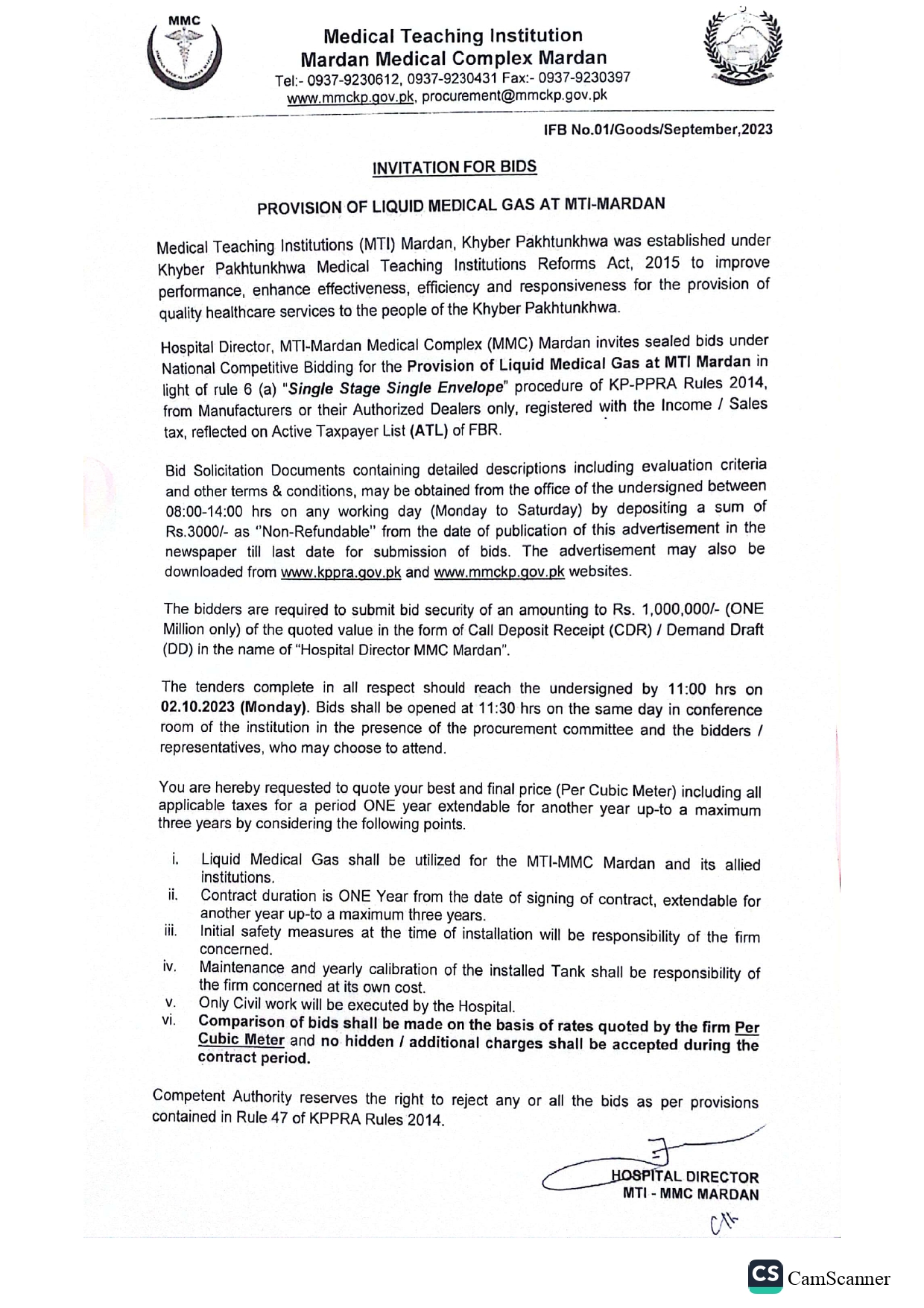 Invitations for Bids 'Provision of Liquid Medical Gas at MTI Mardan '