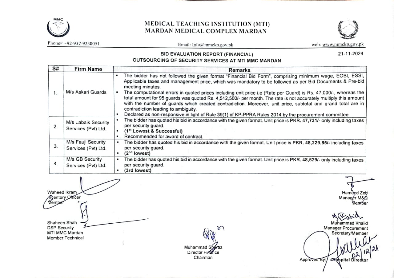 Bid Evaluation Report(Financial) - Outsourcing of Security Services at MTI MMC Mardan