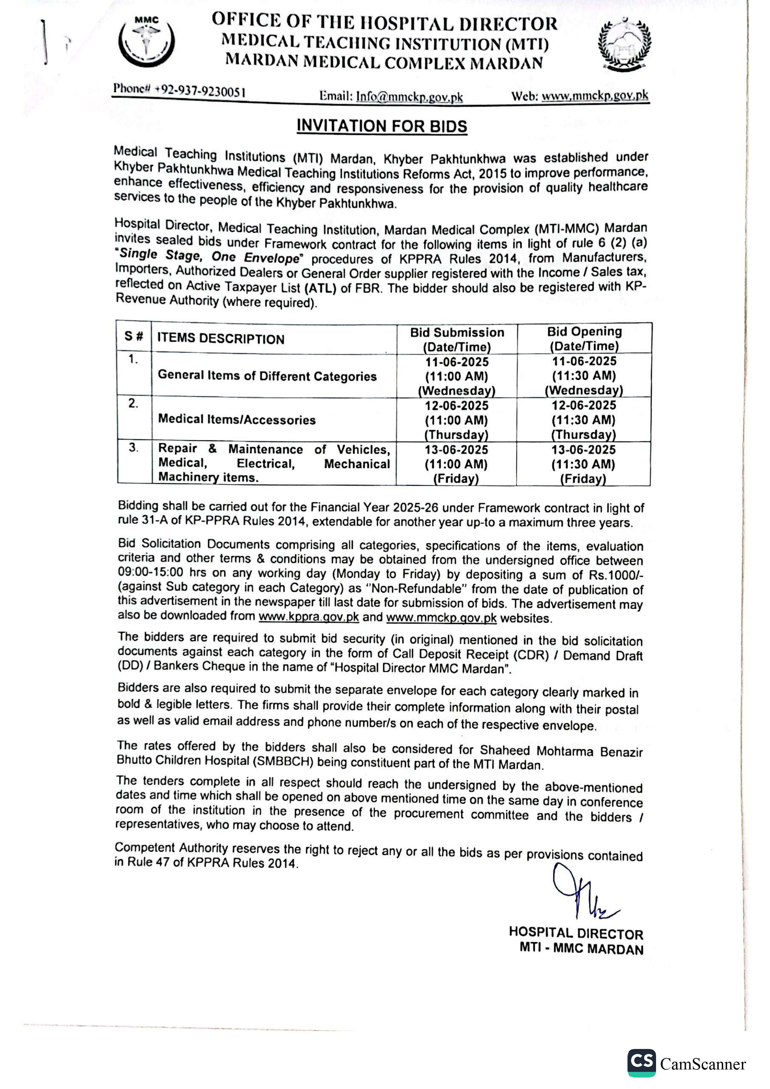 Invitations of Bids for 'Medical Equipments at MTI MMC Mardan'