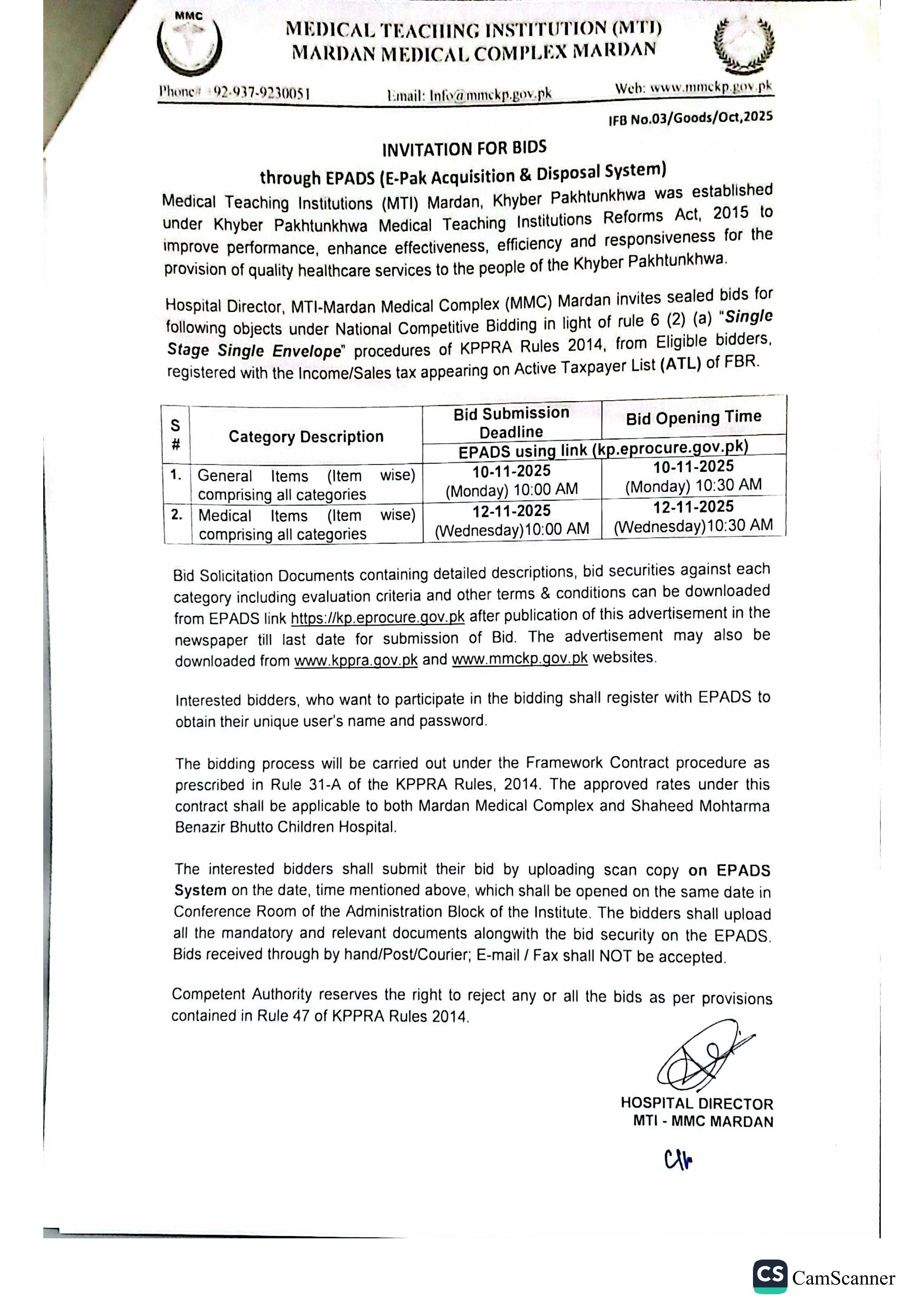INVITATION FOR BIDS through EPADS (E-Pak Acquisition & Disposal System) Medical Teaching Institutions (MTI) Mardan