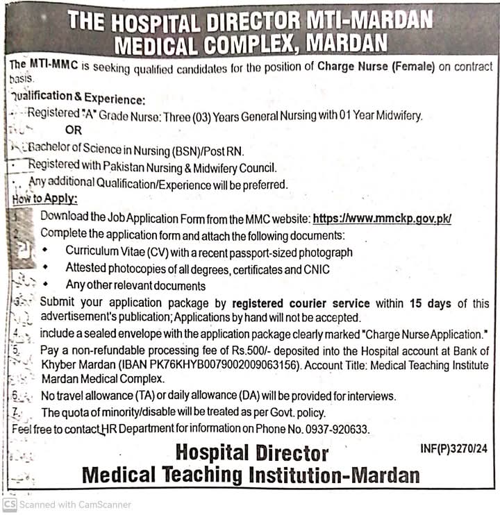 Nurses Vacancies at Mardan MTI MMC December 2024