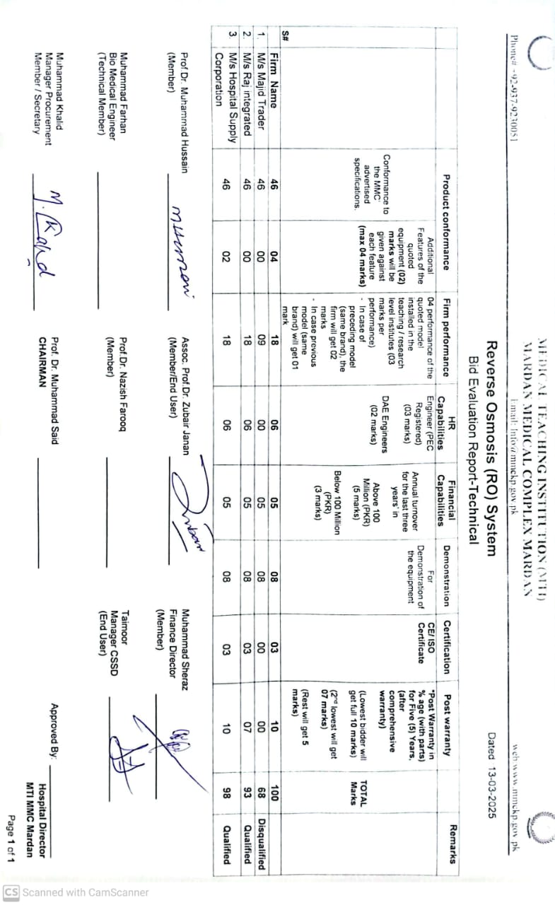 Bid Evaluation Report(Financial) - Static X-Ray Machines 500mA at MTI MMC Mardan